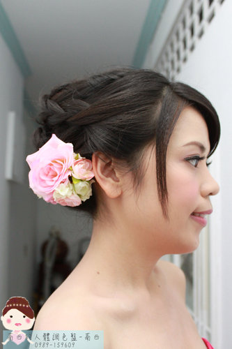 髮型側面,萳西做了局部編髮,新娘髮量足夠,編髮造型就顯得更立體了,髮量少的新娘可以在頭髮上夾些玉米鬚,如此一來髮量會顯得增多!