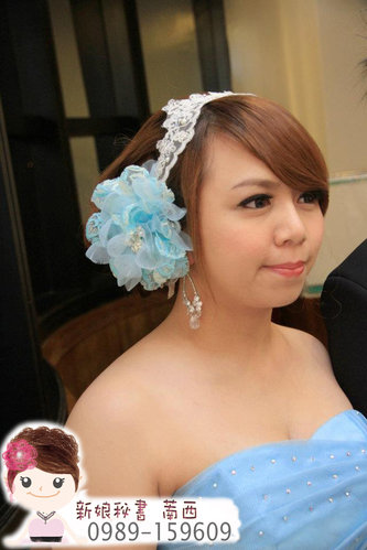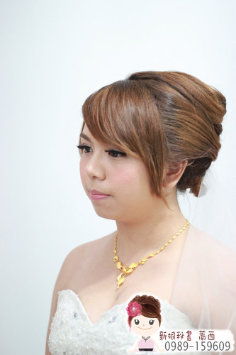 這款白紗迎娶包頭,髮型側面及頂部,萳西做了立體的分區,有別於傳統白紗包頭,新娘子亮麗的髮色,讓這款迎娶造型更顯立體!有些新娘子喜愛原有的黑髮,但又如果想呈現較立體及柔和的新娘髮型,適度的染髮是必要的一環!瀏海.頭髮層次,也必需適度修整,綜合以上條件,更容易達到理想造型!在髮絲線條及立體度上,有大大的加分作用.
