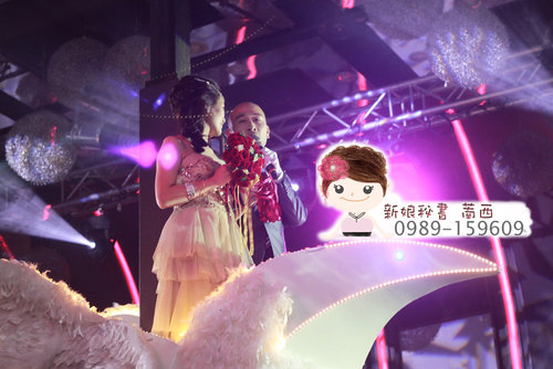 二次進場,新人搭了天鵝出現,新娘有懼高症,婚禮前幾天還到餐廳試搭練膽!