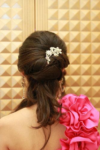 髮型上,採分區單股扭轉及編髮做設計,搭配水鑽飾品,不讓視覺太複雜!