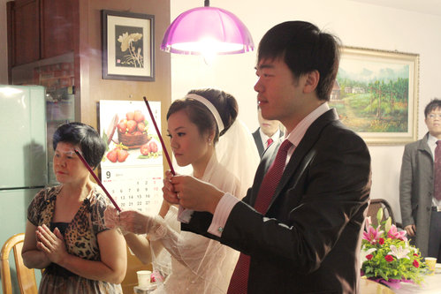 迎娶前 新人對家中祖先及神明告知 今天家裡的掌上明珠出嫁了